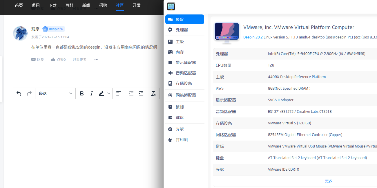今天用vmware workstation pro 16装的deepin 20.2.1,运行虽然很流畅,但只要一点商店,就闪退。深度邮箱应用只要配置好,点确定,就是闪退,以后一直闪退。还有深度影院也有问题,打开后等10几秒就闪退。卸载后命令行重装应用也没用。