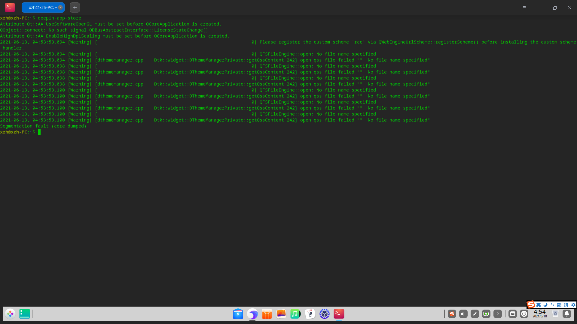 安装的系统是最新的Deepin 20.04, 安装在 virtual box的虚拟机中,安装了 虚拟机的增强服务,系统安装后安装了 build-essential 组件。然后尝试打开 deepin-app-store 的时候,发现会出现窗口闪退,百度了一下这个问题,有网友指出可以卸载再安装解决问题,因此就 apt autoremove deepin-app-store, apt install deepin-app-store. 问题依然没有解决。在终端中直接运行程序,显示 segmentation fault. 目前测试了系统自带的软件,AppStore和Mannual都会出现闪退的情况。App Store打不开的截图放在下面,不知道这样的情况是因为系统安装在虚拟机的原因还是因为其他的原因,就先反馈在这里,希望对系统改善有所帮助。