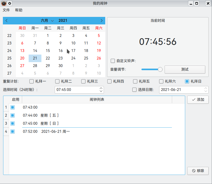 2021-07-01 更新v3.0.5版(静态编译版,文件大,适合更广泛的Linux系统,系统不需要安装Qt库,闹钟程序已经内置,此版本deepin有标题栏)