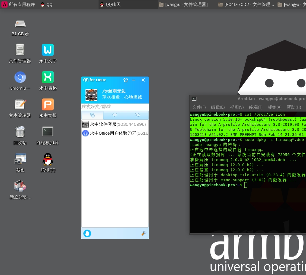 是ARMBIAN,下面的坛友说的对,是XFCE。亮点是办公软件,这是还没亮出来的一版。