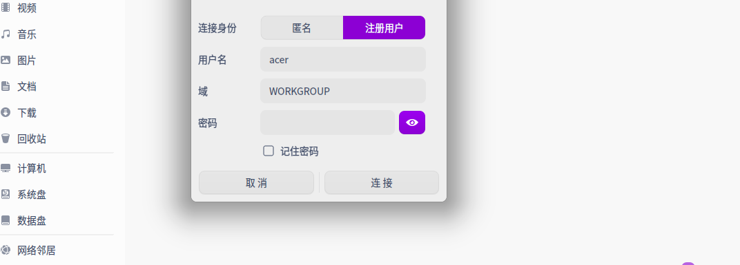没填错密码账号,smb://192.168.XXX.X,Windows就可以,呢个域不知道对不,默认的,就是挂载失败。