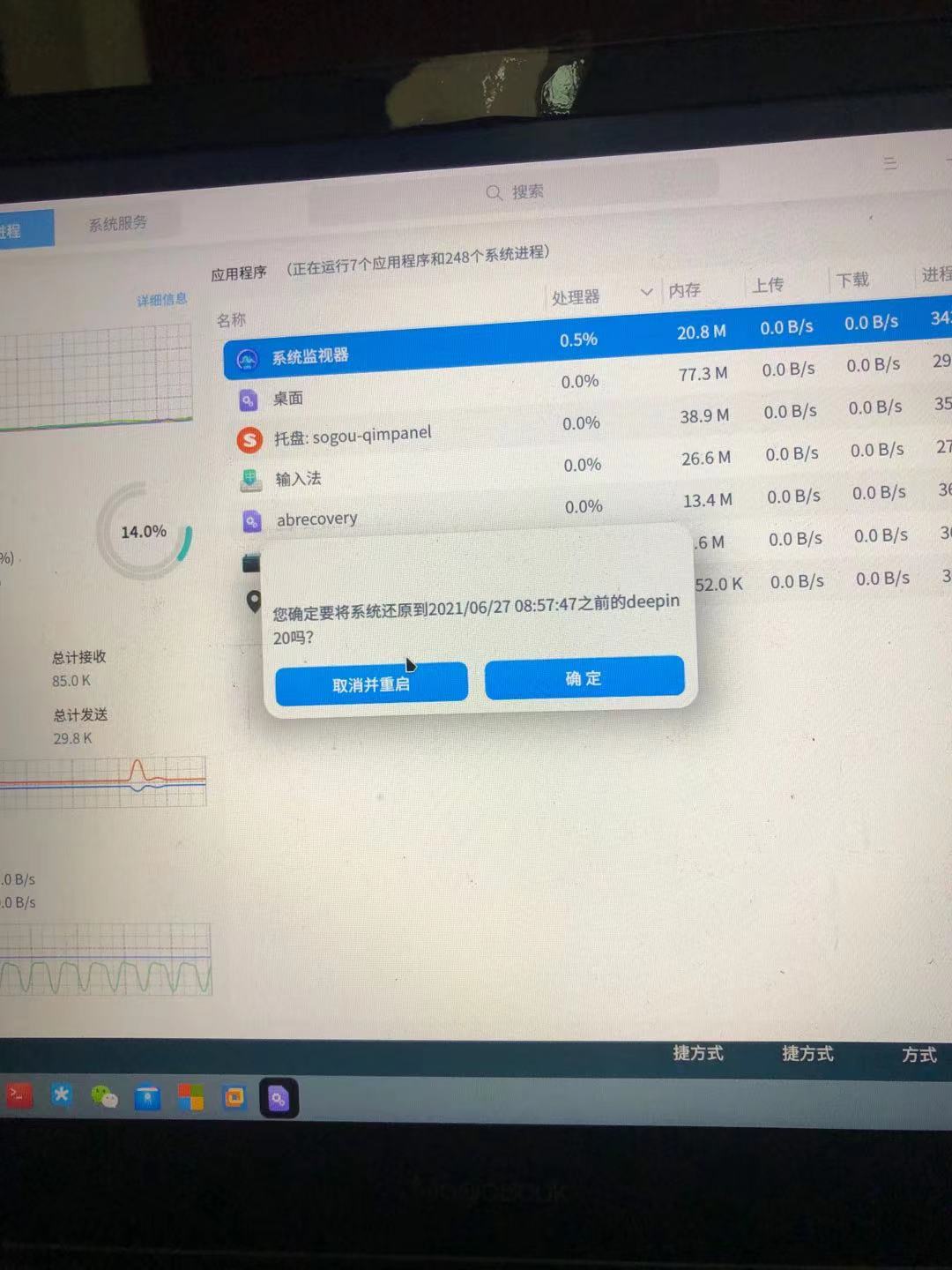 详情:经过我十几次重启不停点鼠标终于抢到了控制权,从进程监视器得知是/usr/bin/abrecovery脚本随着开机启动导致劫持让我选择恢复还是取消恢复重启(当然重启还是一直弹这个);