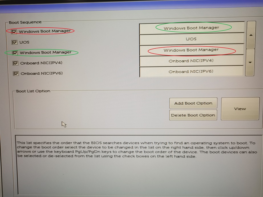 但是启动时,我选择deepin界面的windows启动项无法进入系统,然后我就进入了主板设职看了一下启动选项,结果发现win和uos是两个独立的部分,而且里面有两个win的启动项,只有一个起作用(绿色圈的),另外一个不起作用(红色圈的),所以现在每次要进入deepin,都要在主板这里设置一下为uos才能进入,要进win也是要设置。