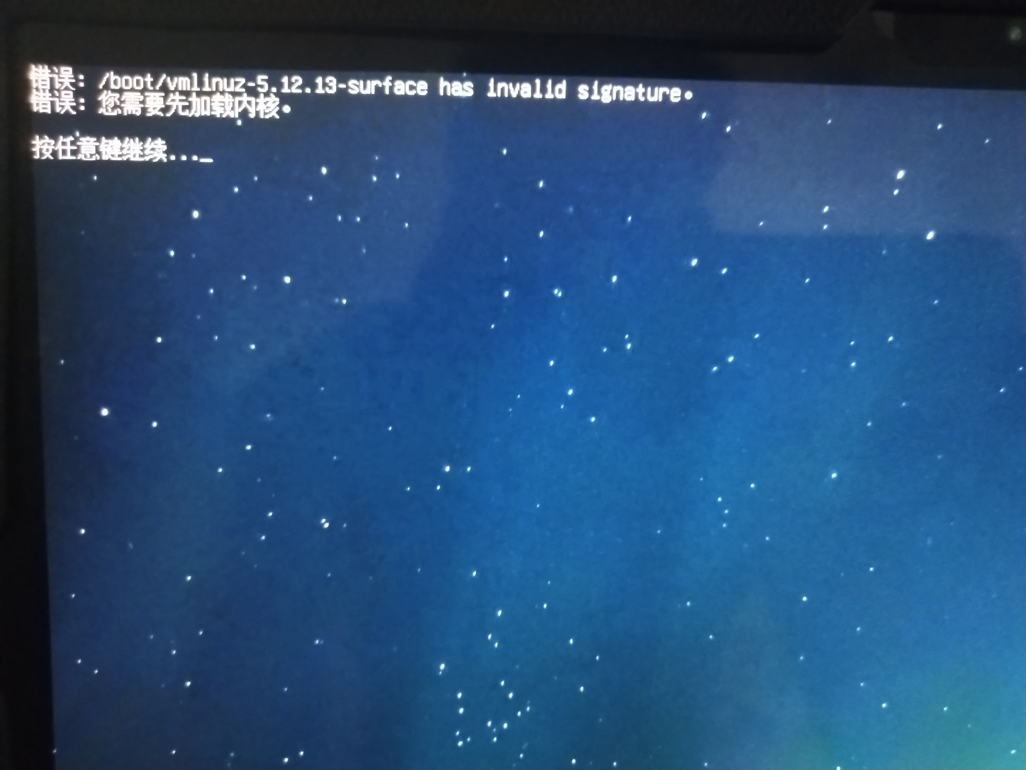2021-07-02 00:48 建议直接关 secure boot。如果实在是不想看到开机时红色的解锁标志,也可以按照 linux-surface 仓库的 wiki 设置 secure boot。