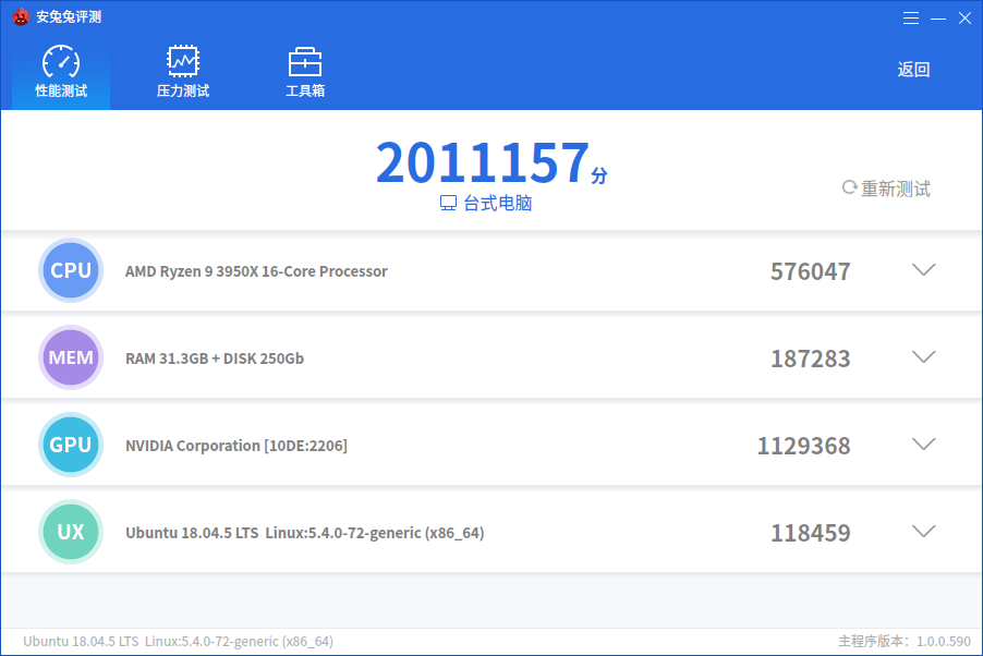 安兔兔评测Linux版最大程度的还原了Andorid版安兔兔评测的测试项目,依然分为CPU、GPU、MEM以及UX四个项目。