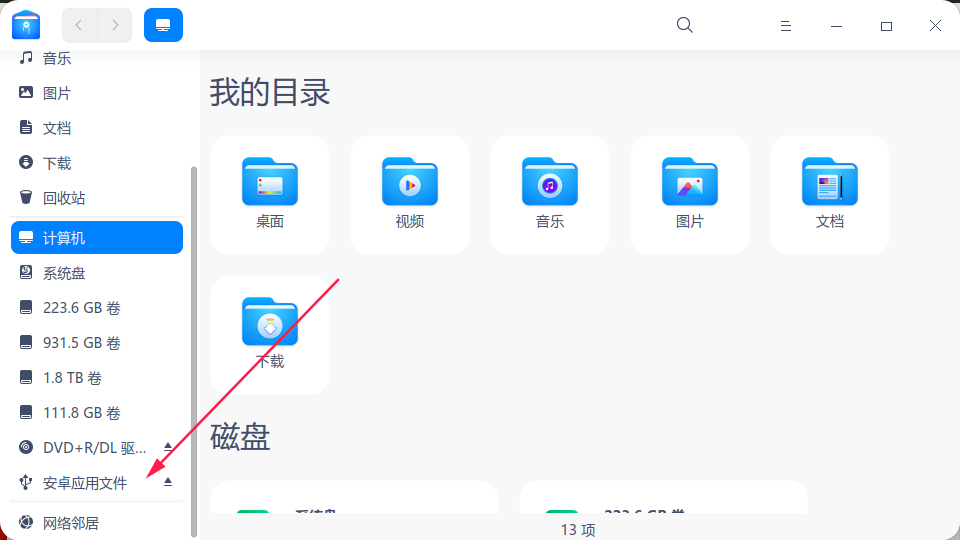 如何得知开机什么时候可以运行Uengine容器?答案来了,就是去文件管理器,看看“安卓应用文件”这个盘符显示出来没有,如果显示出来了,说明Uengine模块已经加载完毕,可以打开安卓APP啦。