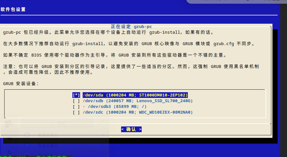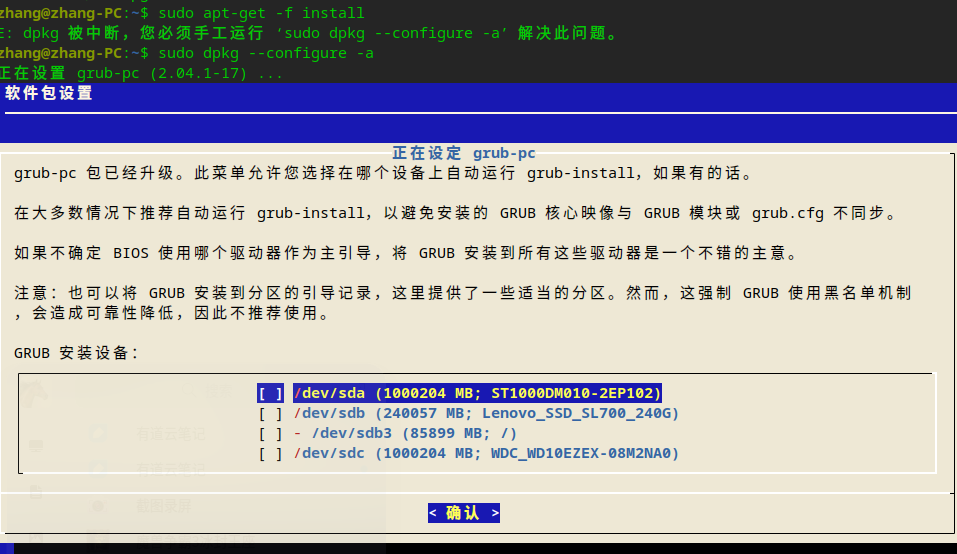 终端执行 sudo dpkg --configure -a,完成grub-pc设置后,再次在控制中心安装更新后成功。