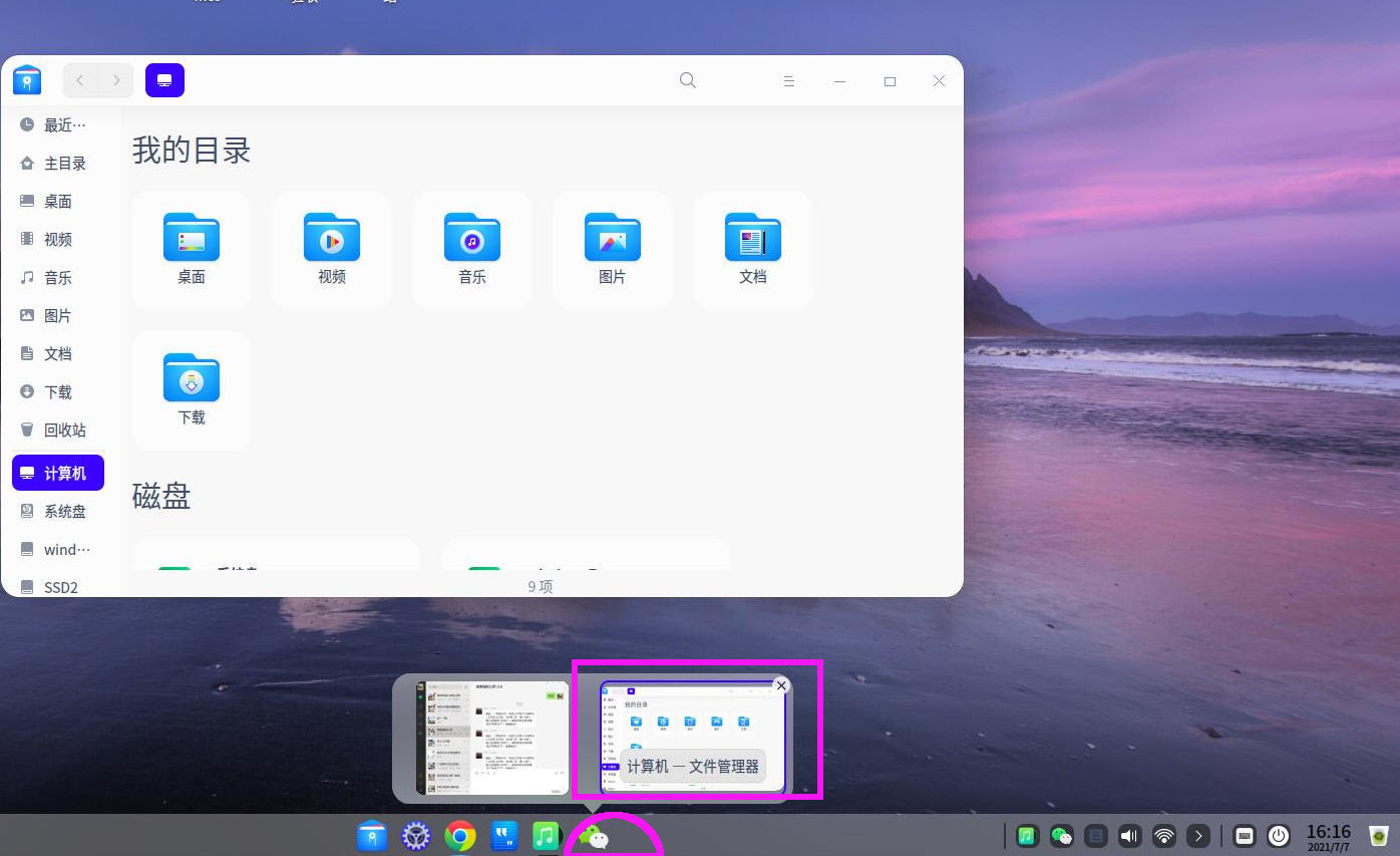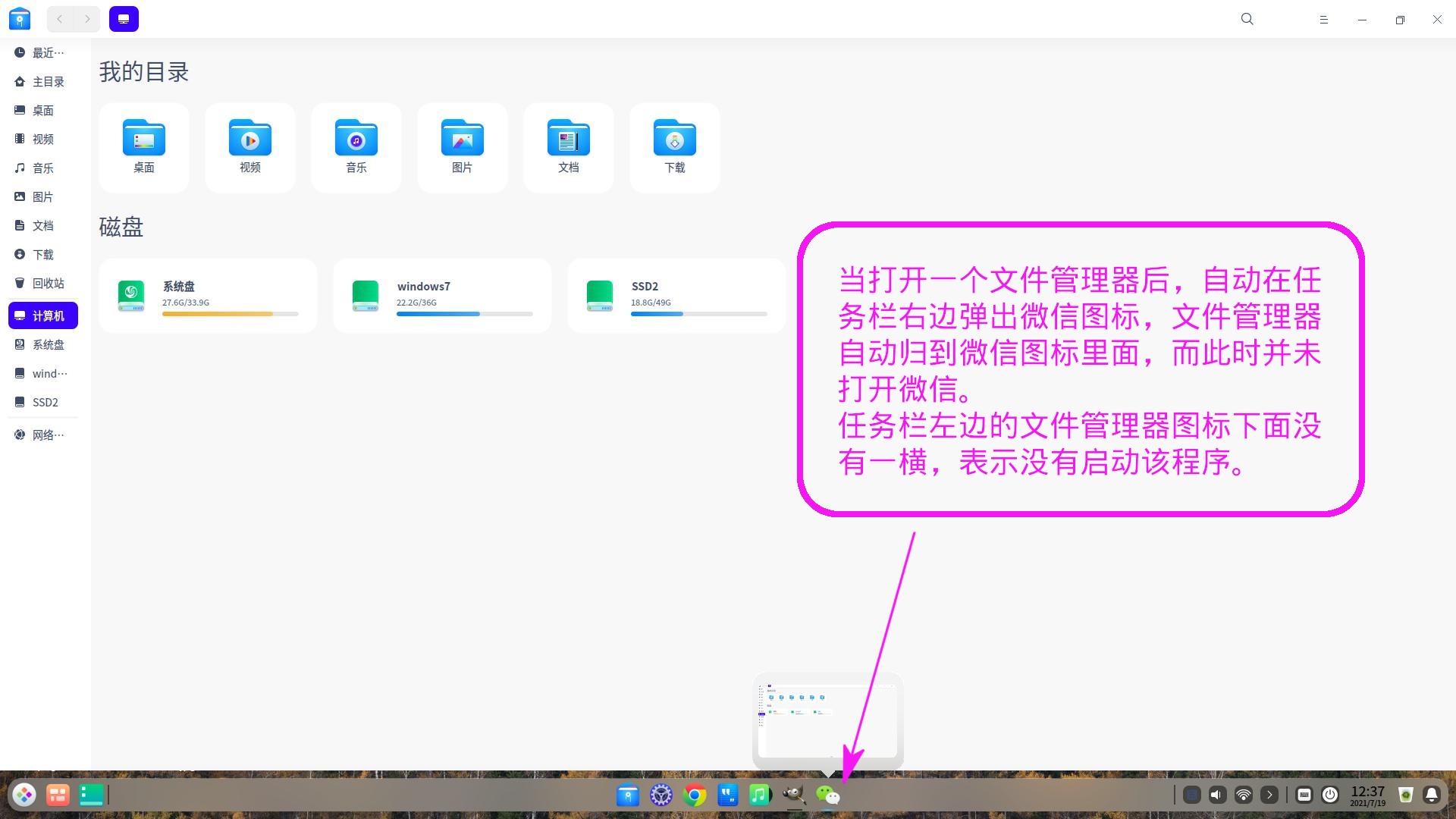 位于底部任务栏中间的DOCK栏程序区的微信图标,点击时出现两个小窗口,原来是把微信和文件管理器当作同类项合并在一起了,造成一定的混乱