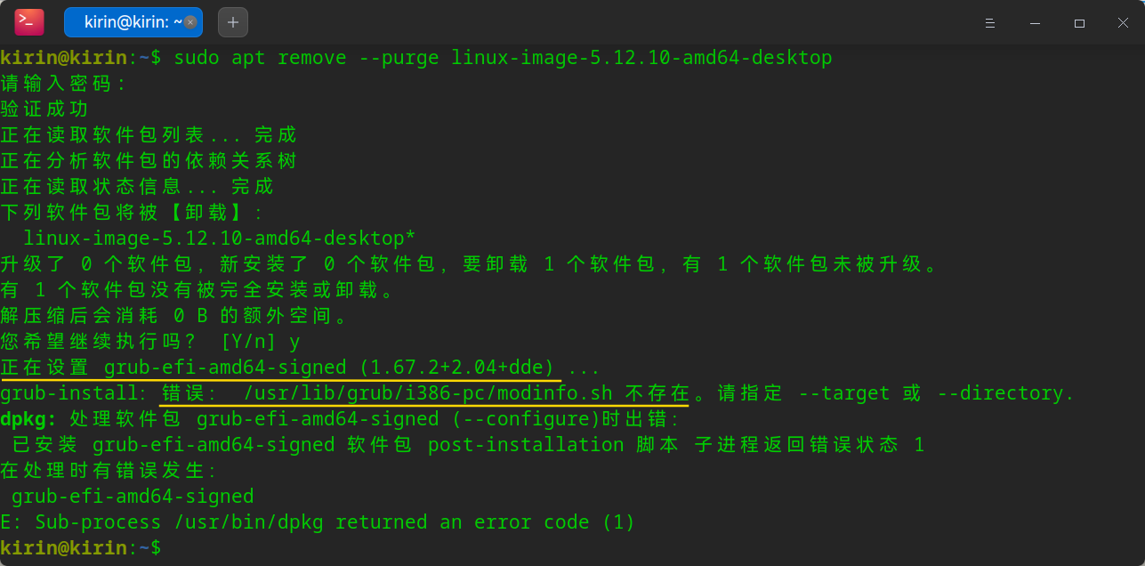 2021-07-12 18:02 试试先重装 grub-efi-amd64-signed 这个包看看为啥报错,不行的话就先卸载这个,然后再卸载内核,最后记得装回来