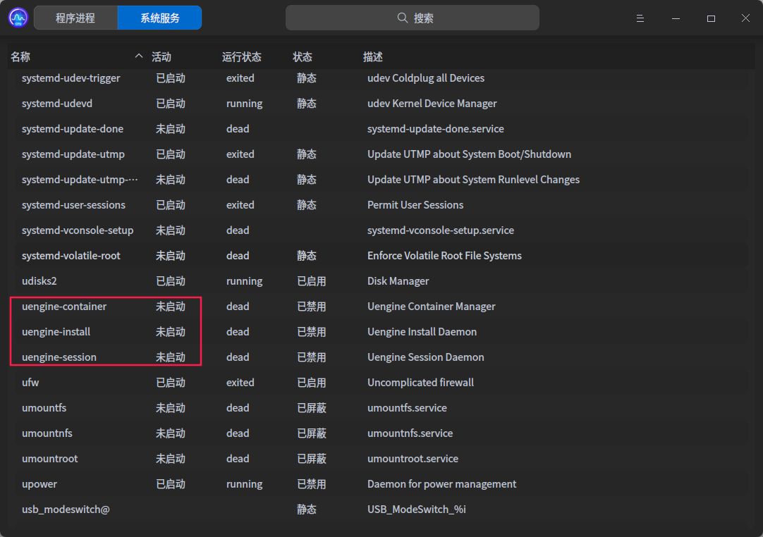 看了下uengine-install 这个服务就是安装一下uengine相关的组件,目前其他两个服务是正常的状态,但是双击安卓应用打开没有任何反应
