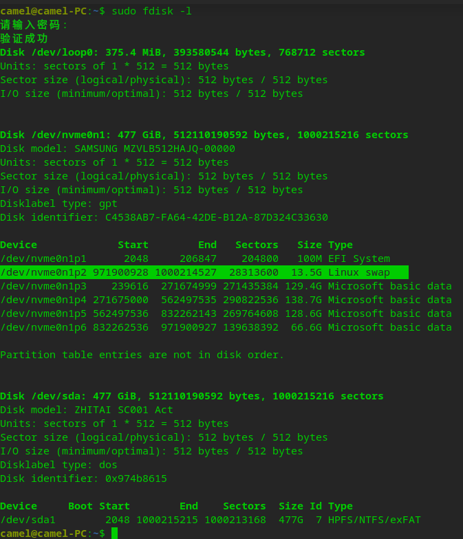 开机后fdisk -l可以看到sweep分区在/dev/nvme0n1p2