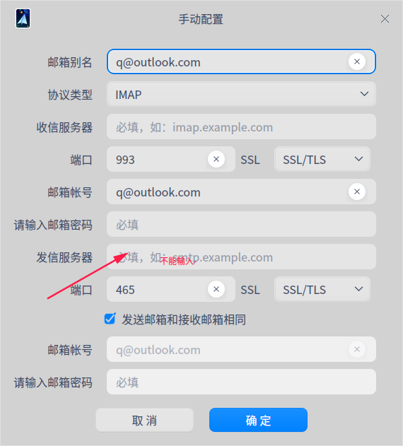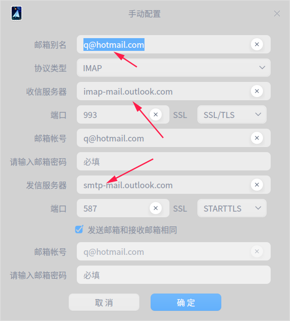 描述:发信服务器中不能输入-号。而@hotmail.com的邮箱地址可以自动识别,手动配置文件和outlook.com所需要打一致。