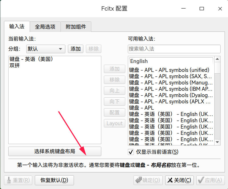 *需要注意的是,fcitx5中文输入法默认词库很少,词库需要额外手动下载并放置在~/.local/share/fcitx5/pinyin/dictionaries/ 目录下。