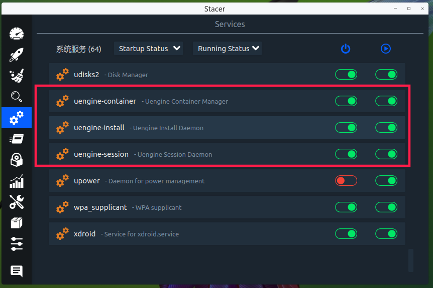 下图 红框中,三个服务确保都有启动。最好在星火应用商店中 下载安装 uengine运行时 1.22版。方便 本地安装APK或查看 app使用情况。