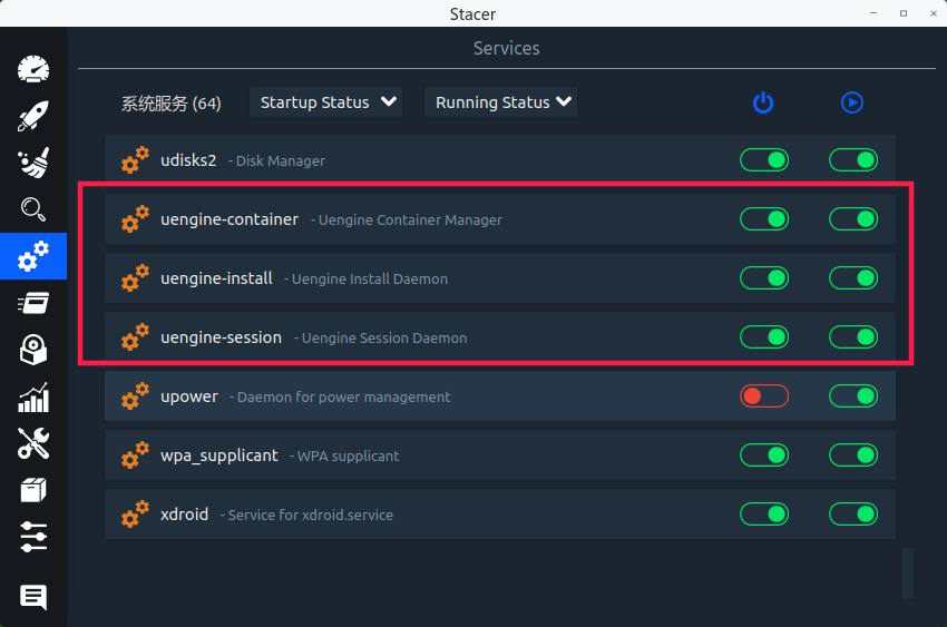 2、使用 stacer 确保 uengine三个服务启动