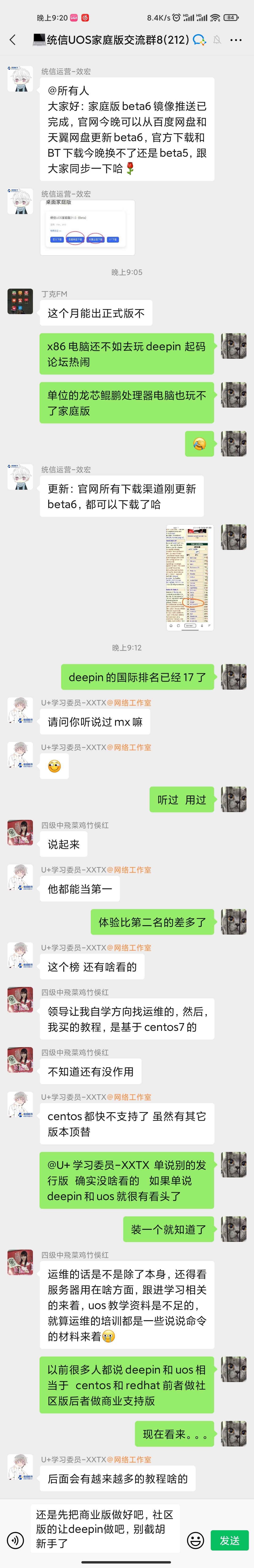 看到这个群就一肚子气,什么学习委员,不是来解决问题的,就是来跟用户怼着玩的,还经常散播假消息,有时候让我都不敢相信官方的消息了。我建议统信想做好,先把那些乱七八糟的学习委员整治下。