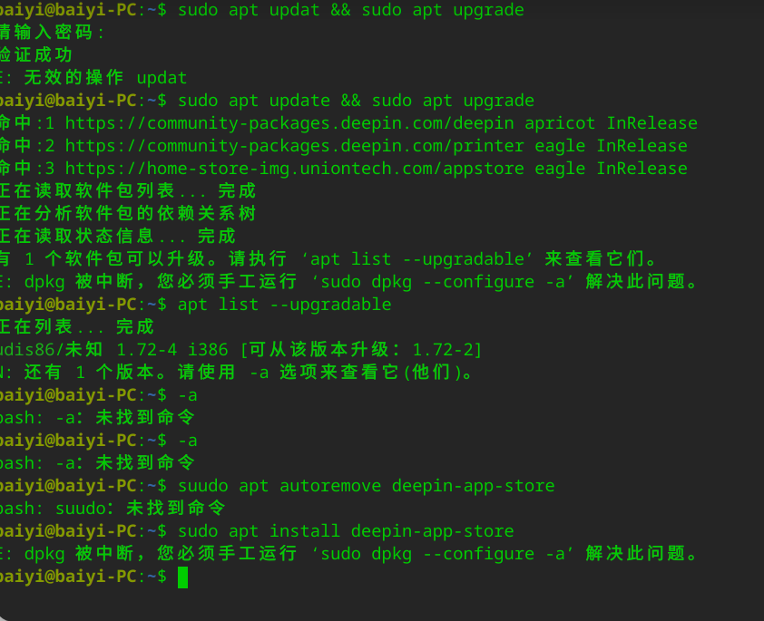 2、打开终端(Ctrl + Alt + T),输入命令:sudo apt update && sudo apt upgrade。这个过程可能会有交互,你按终端的提示操作。此步是更新你的软件源,并升级必要的软件版本。有可能将你的应用商店版本一块升级了。这一步有可能需要重启一下电脑。