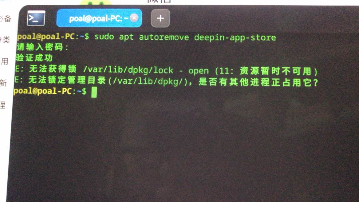 3、如果你的软件商店仍无法安装软件,可以将当前的软件商店在终端手工卸载,然后重装。方法: