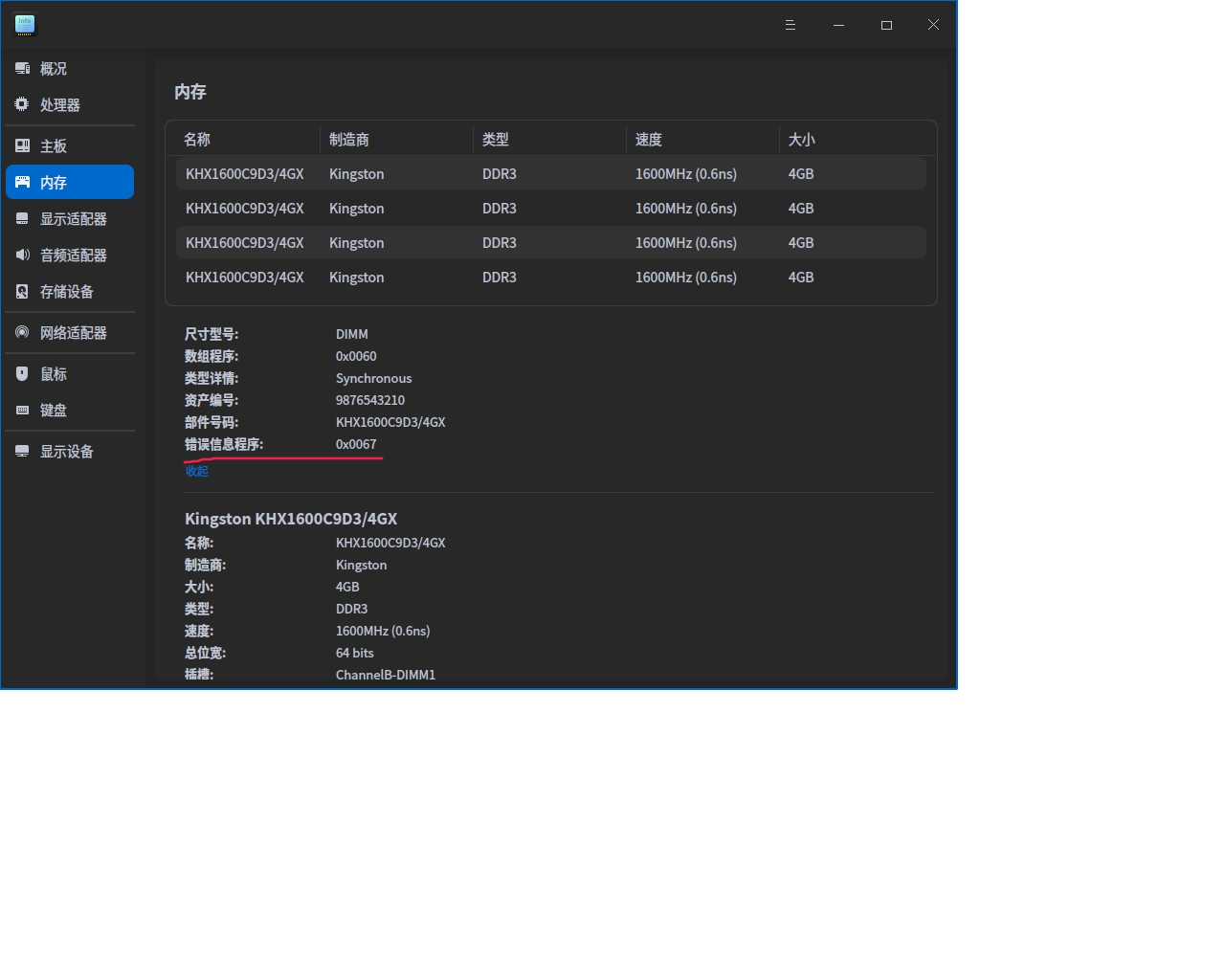 最近给老古董的机器加了两根DDR3的内存,打开设备信息应用查看内存时发现新加的两根出现了内存错误信息程序0x0067,之前的两根内存没有问题,系统也运行正常16G内存正常识别。请教群里的大佬出现了这个错误是什么意思?