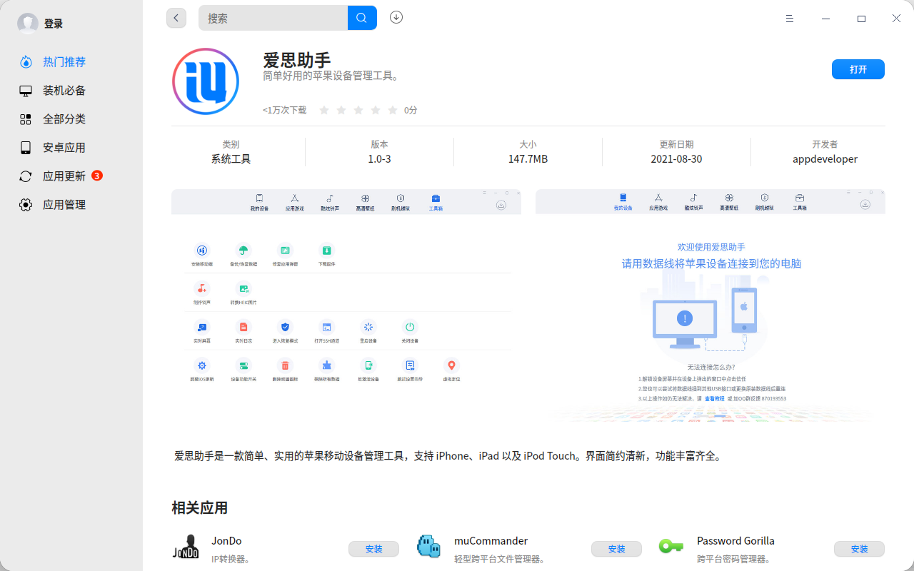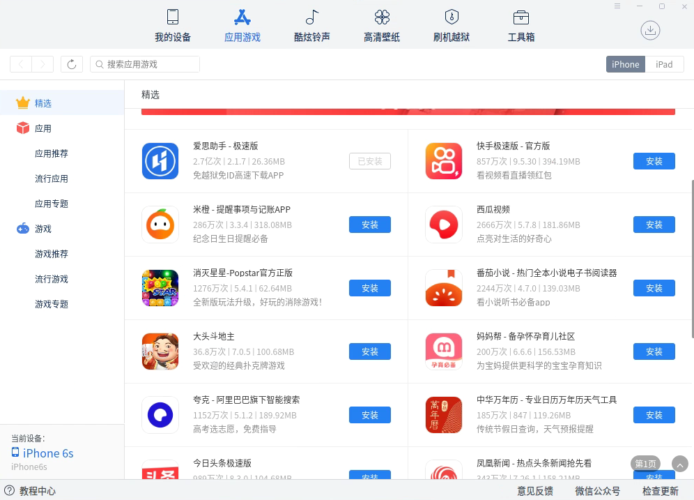爱思助手 Linux 版提供大量应用及游戏免费下载,无需 Apple ID 即可直接安装,搜索需要的应用后,点击“安装”,等待应用程序下载完成后即可快速传输至当前设备。