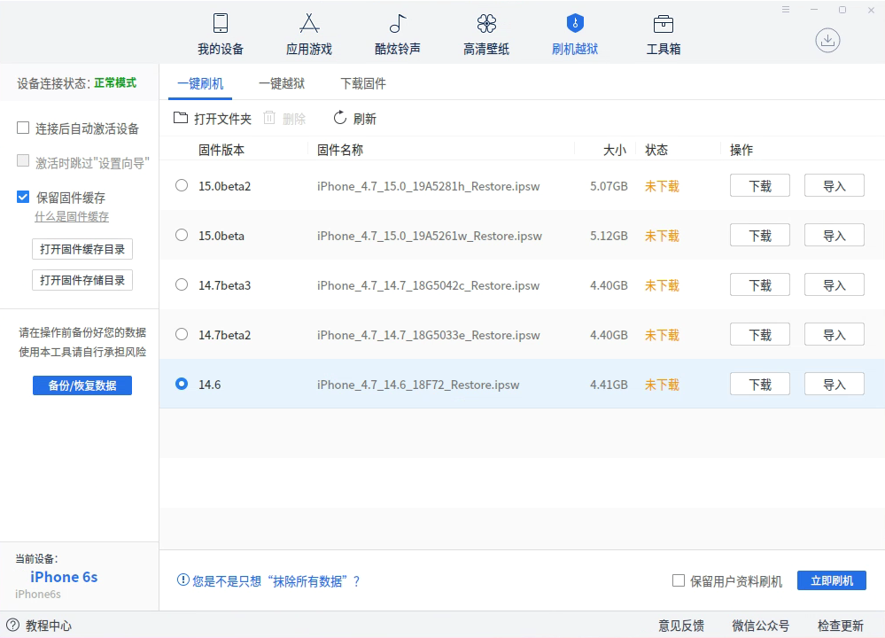 爱思助手智能化刷机功能,只需将设备进行连接,“一键刷机”将自动匹配当前设备可用的 iOS 固件。不仅如此,爱思助手还提供最新测试版固件,无需加入开发者计划或安装描述文件,即可通过刷机体验最新的 iOS 测试版系统。