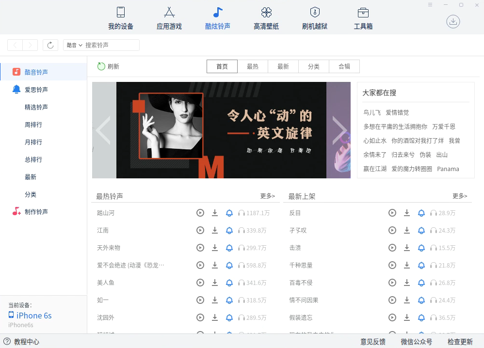 爱思助手提供大量精彩铃声,点击“下载”图标,即可自动导入到设备中,用户可前往移动设备中的“设置”-“声音与触感”-“电话铃声”中进行设置。同时还支持自定义制作铃声,只需点击“制作铃声”,即可添加音频文件进行编辑。