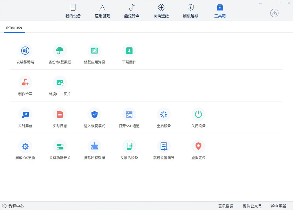 爱思助手 Linux 版内置实用的刷机越狱功能,操作简单,可通过“一键刷机”升级或降级系统,并支持一键越狱。