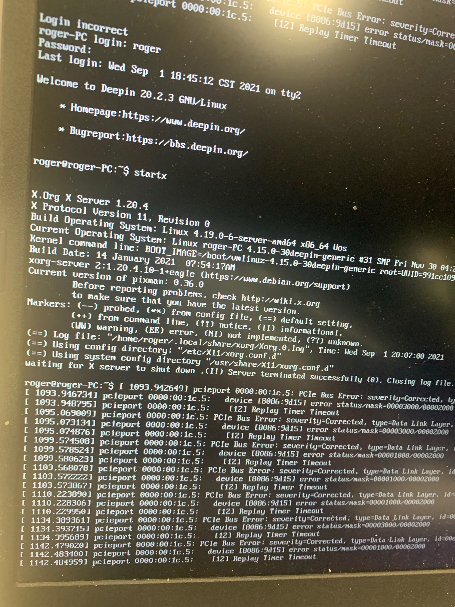 目前电脑能进入到开机logo,然后他一直出现pcieport 0000:00:1c.5: AER: PCIe Bus Error: severityCorrected, type=data link layer