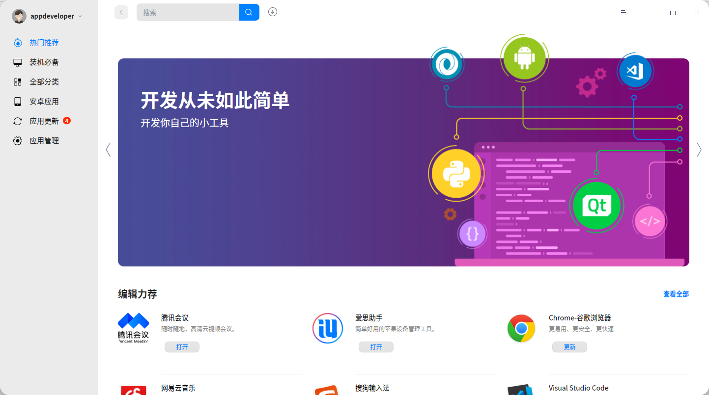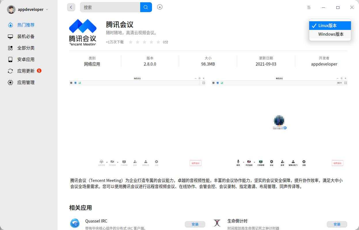 纵观国内,以deepin为代表的桌面Linux发行版,腾讯在这方面的支持显然不足,依靠wine迁移始终不如Linux原版体验畅快,不过最令人的振奋人心的消息来了,腾讯会议(Linux)版本现已登录深度应用商店,欢迎大家下载体验。