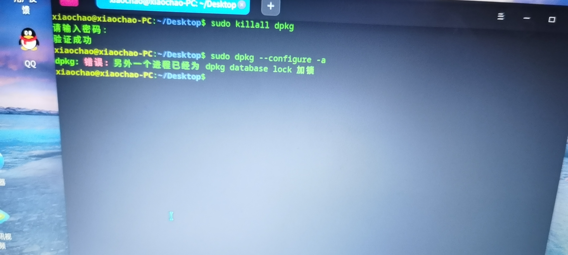 2. 执行 sudo dpkg --configure -a 进行手动配置,应该是应用商店后台哪里卡住了