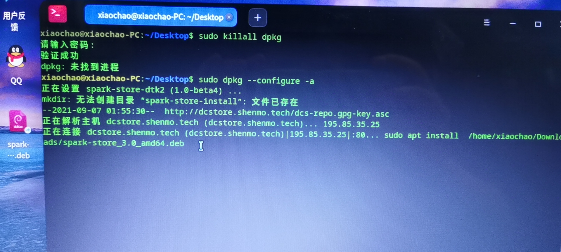 3. 执行 sudo apt install xxxxxxxx (xxxxxxxx 替换成星火商店安装包路径)