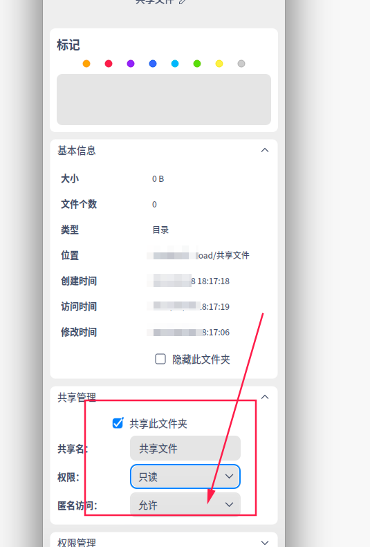 2、找到你要共享的文件夹(前提要这个文件夹是你创建的自己有读写权限),右键呼出菜单依次选择【属性】->【共享管理】并勾选【共享此文件夹】,【匿名访问】选允许。