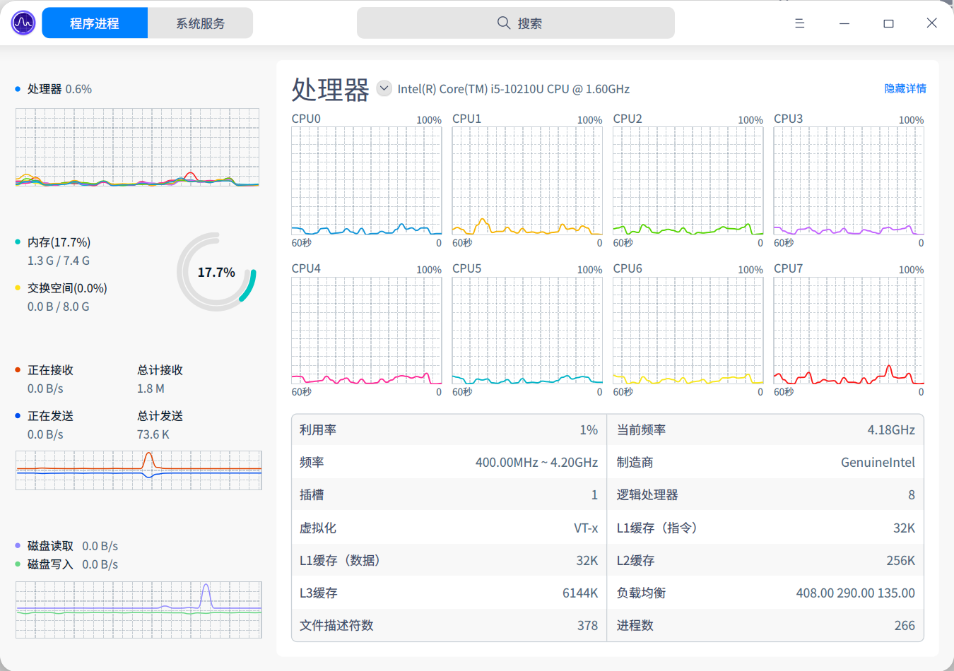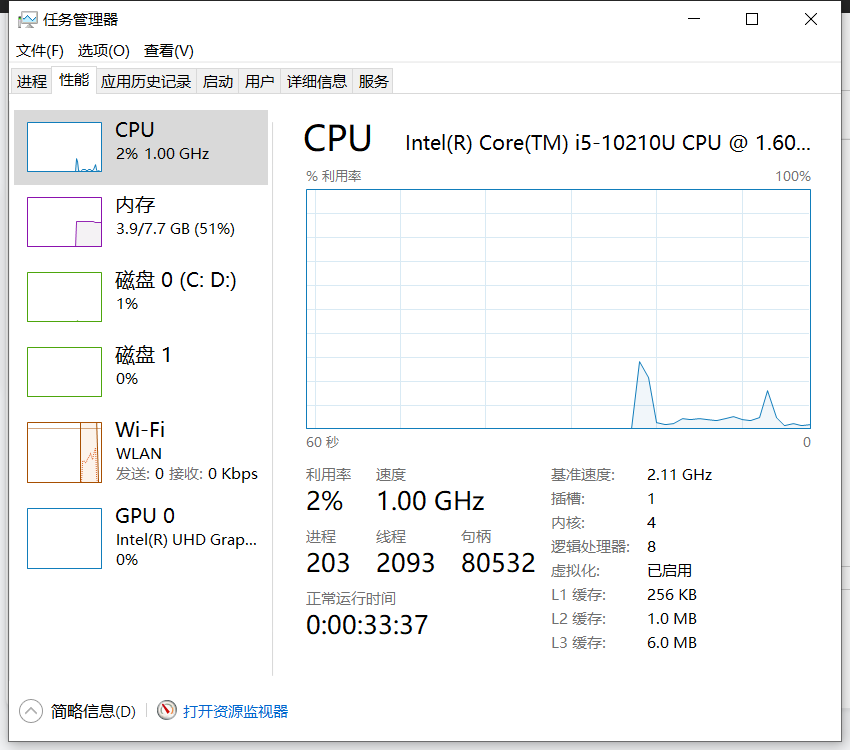2021-09-09 18:11 这是在win10下的CPU状态,型号I5 10210U