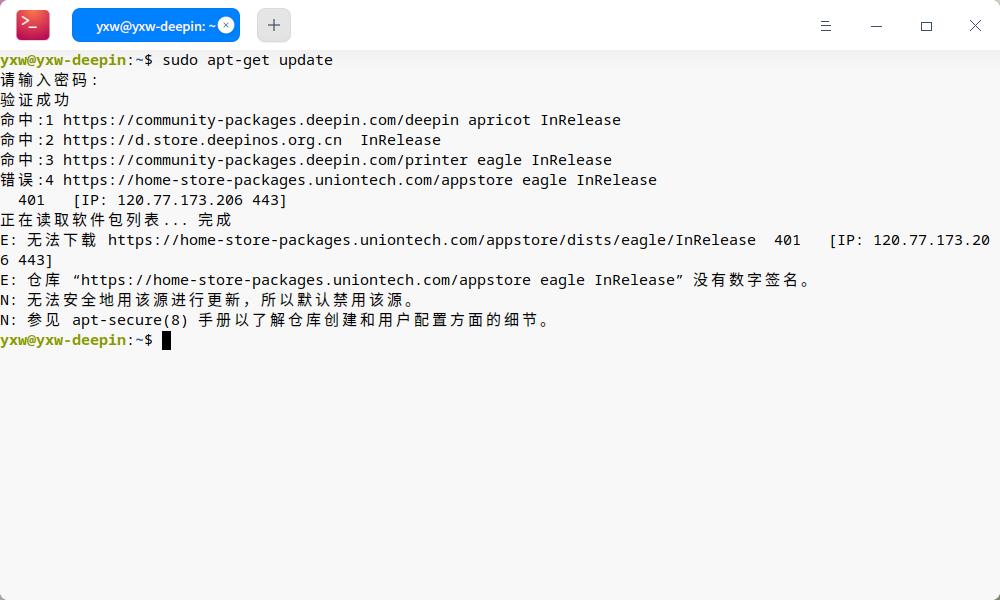解压该压缩包,将里面的 deepin-app-store-home.gpg 文件放入 /etc/apt/trusted.gpg.d/ 文件夹(需要管理员权限),然后执行 sudo apt update 试试看