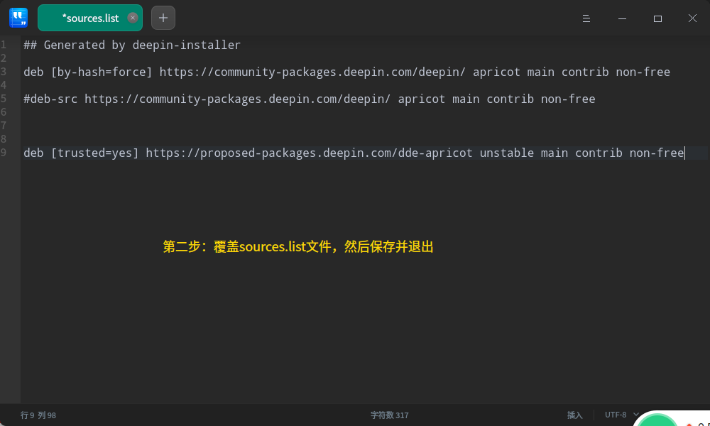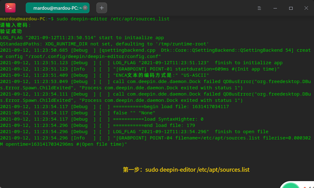 1、将系统修改为内部测试源,终端执行以下命令:sudo deepin-editor /etc/apt/sources.list