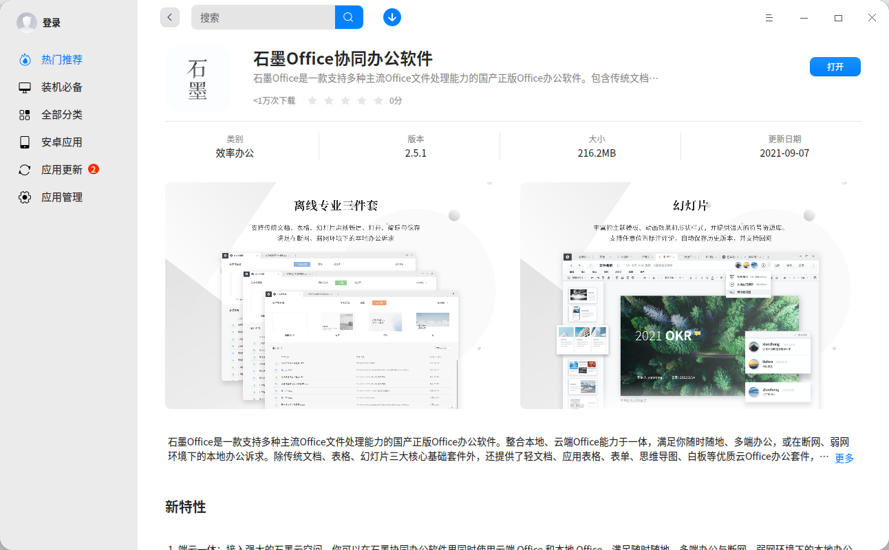 打开深度应用商店,搜索框输入“石墨Office协同办公软件”点击安装即可。