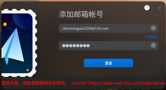 你需要网页登陆126邮箱,在里面找到一个叫授权码的信息,然后把授权码作为邮箱密码设置在软件里才能使用。