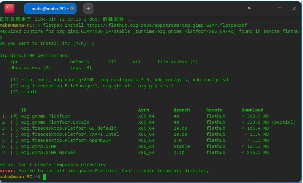 安装GIMP时,flatpak返回不能创建临时目录