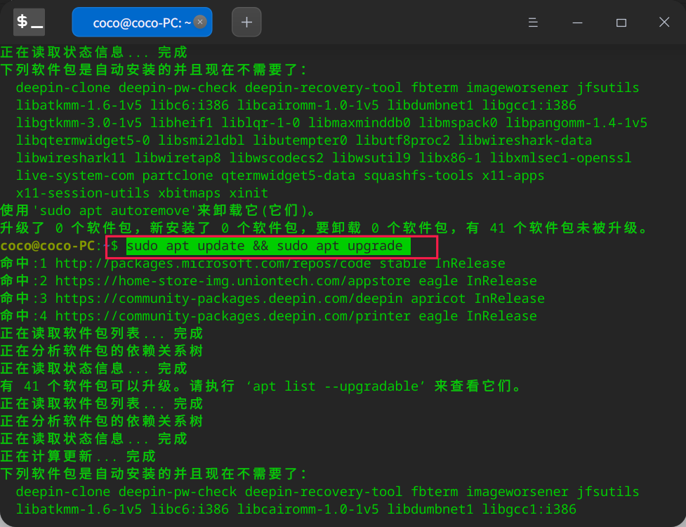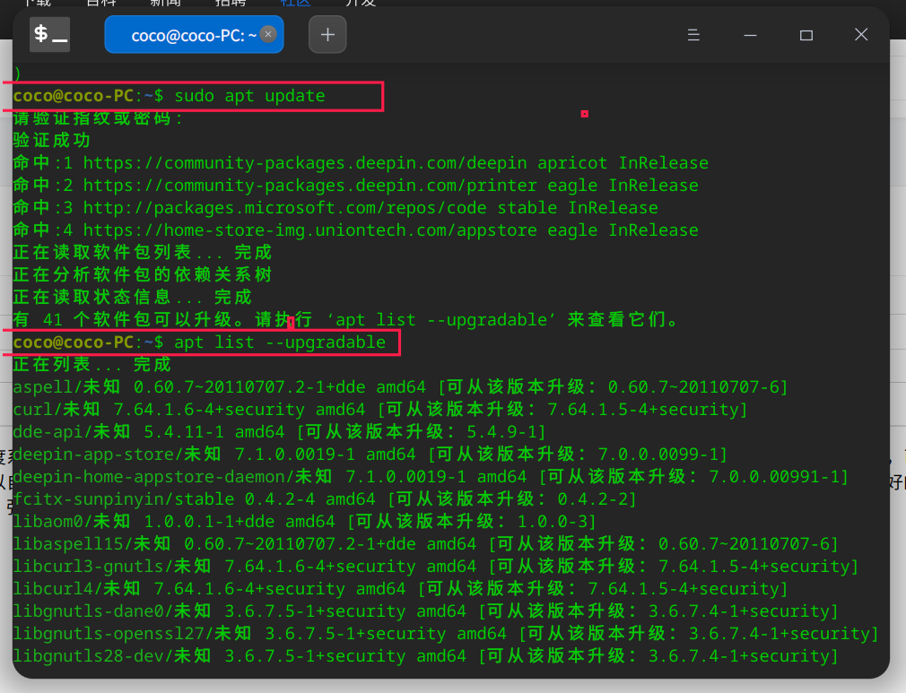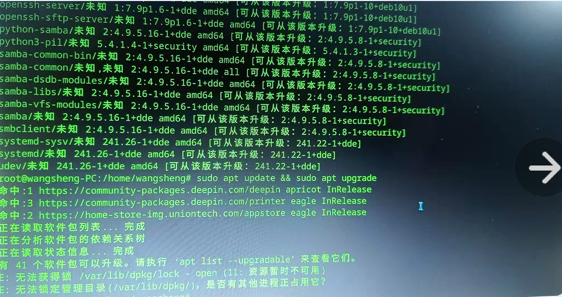 今天下午安装了,深度系统。作为一个老玩家,回来继续使用深度,出现软件商店应用不能安装,这个体验感确实很差,不过怎么说呢,已经不是当年那个只会伸手的小白了。所以自己摸索了一下,一开始看论坛,说是仓库挂了,我想着再等等,直到晚上了,我觉得这不应该啊。尝试从命令好的角度,查看一下有多少可以更新的软件。强制更新一下。修复过程如下。
