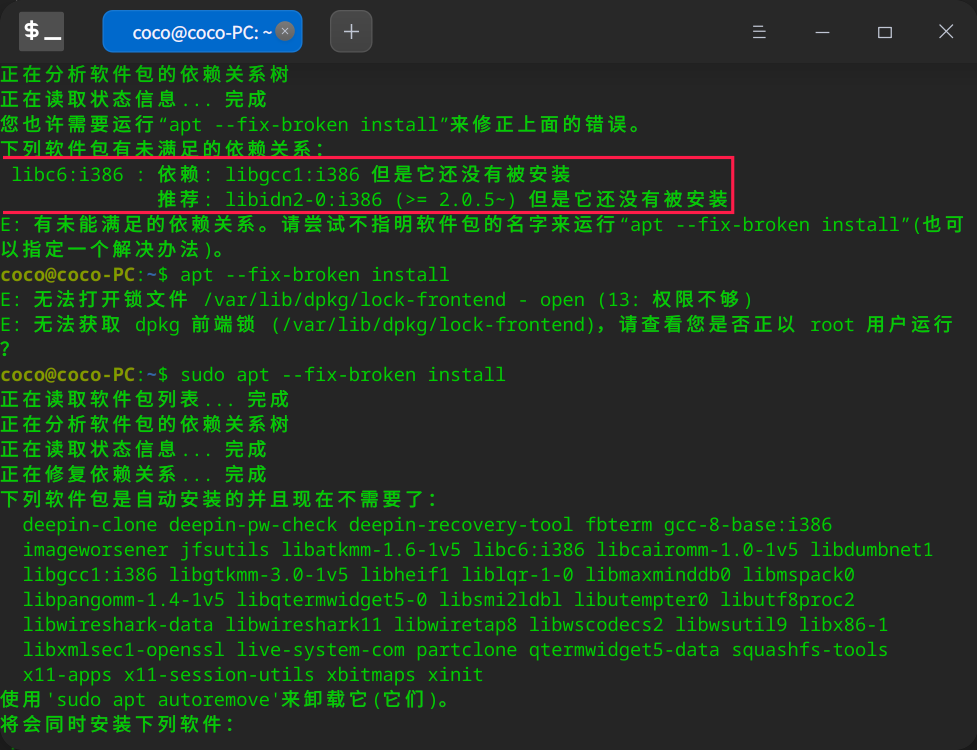 按照提示修复:sudo apt --fix-broken install 会提示安装选择是否确认,输入:y