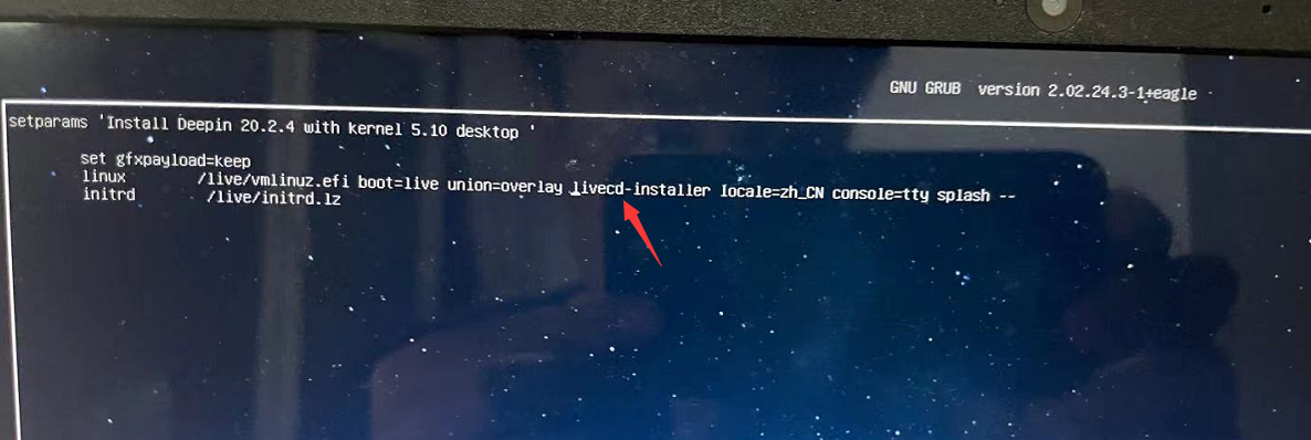 3、在安装Deepin选择菜单,按e键进行编辑,删除livecd-installer,CRTL+X键启动,进入U盘Live系统