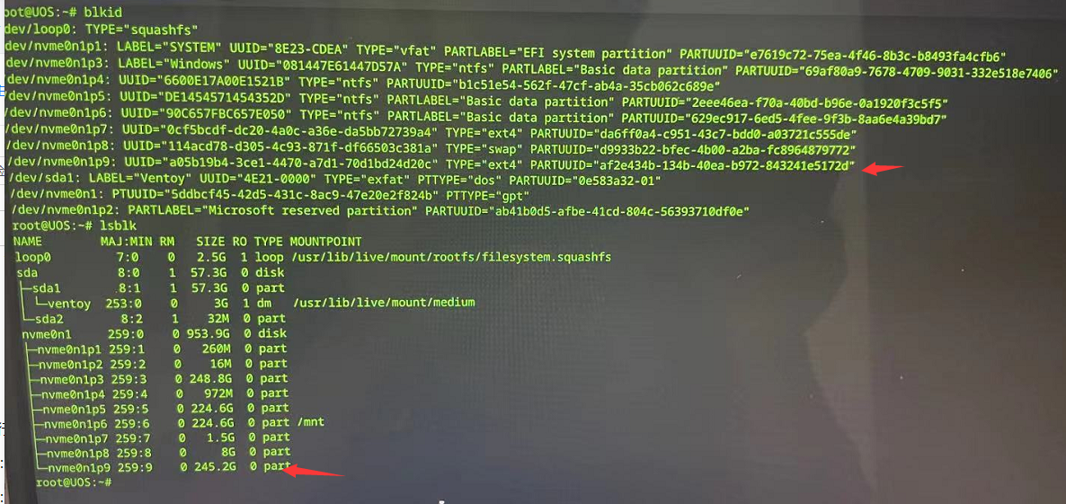 执行blkid和lsblk定位Deepin系统的分区,比如如下图我的Deepin根分区是nvme0n1p9
