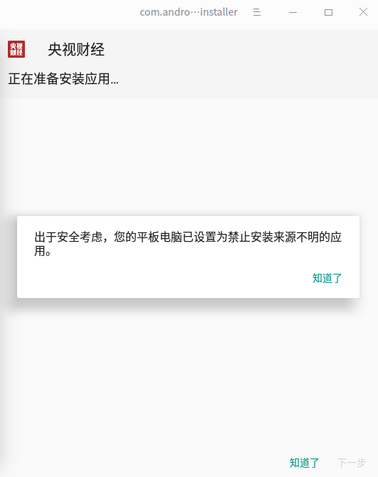 今天通过系统自带的软件商店安装安卓版本的“央视财经”,安装完成后提示发现新版本,必须升级,点击升级后提示“出于安全考虑,您的平板电脑已设置为禁止安装来源不明的应用”,谁知道这个怎么解决呀