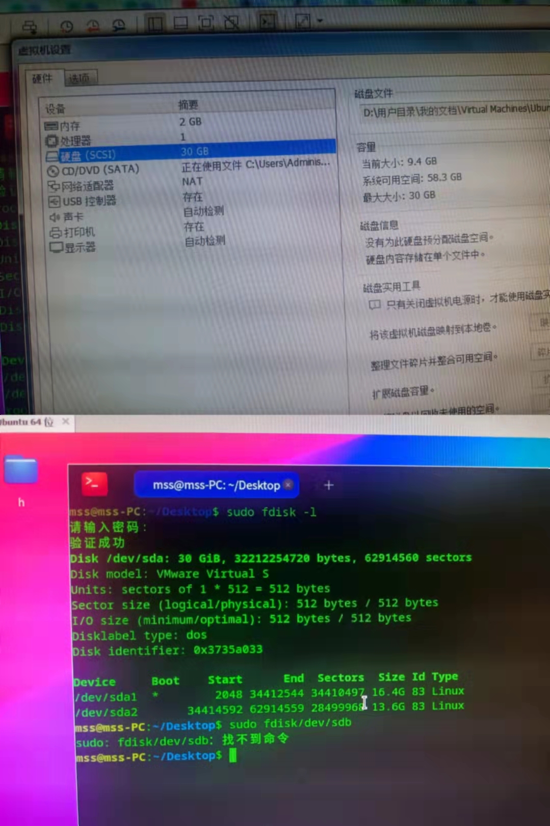 我觉得那个“系统可用空间58.3G”可能说的是你实体机里D盘的剩余空间吧,虚拟机硬盘的大小还是30G没变吧