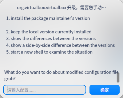 2021-10-18 02:12 实际测试了一下,这个版本的 vbox 应该有问题,会在 UEFI 引导的机器上安装 grub-pc,这里的提示就是问你 /etc/default/grub 文件是否要被覆盖掉。