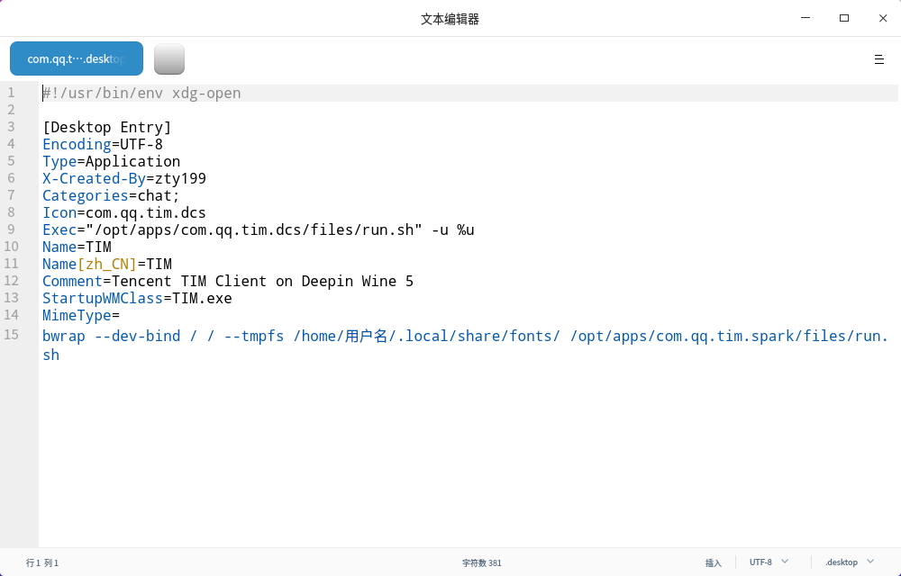 2、进入/usr/share/applications找到TIM,管理员打开TIM的desktop编辑exec路径