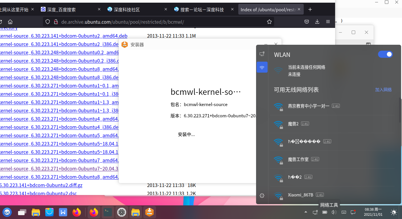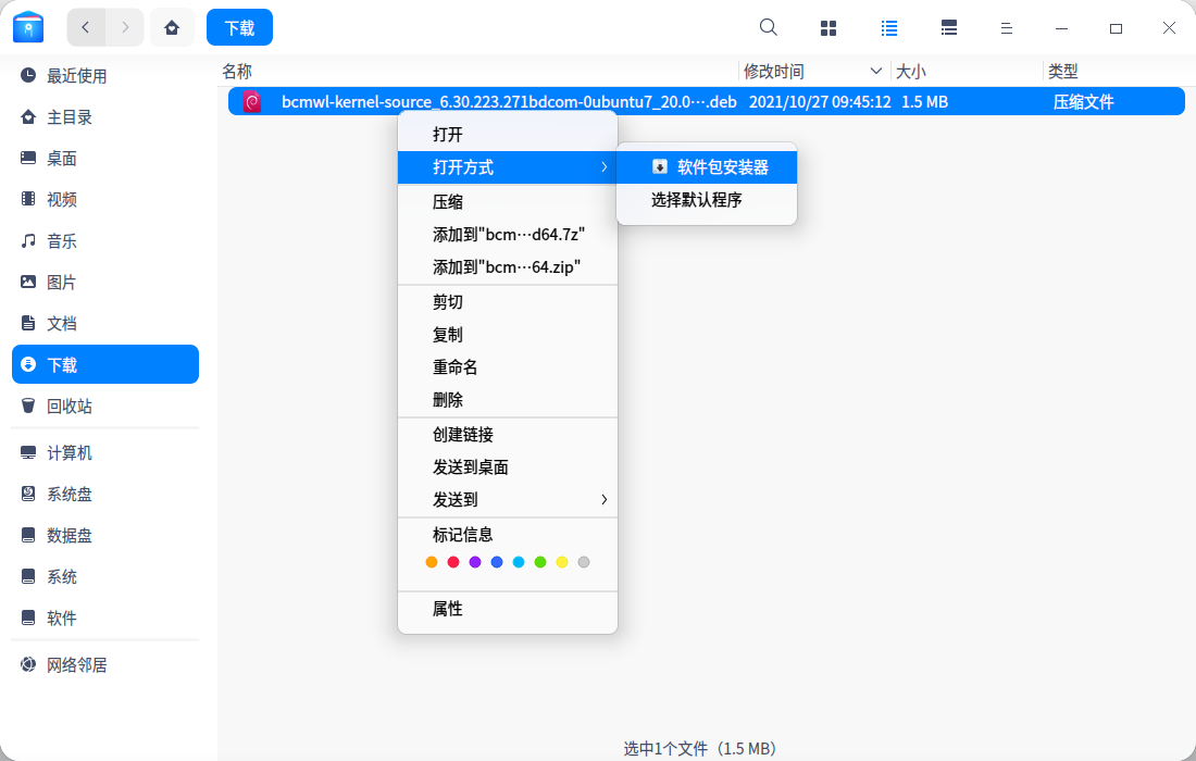 然后,下载bcmwl驱动地址:http://de.archive.ubuntu.com/ubuntu/pool/restricted/b/bcmwl/ 下载后要右键点文件选打开方式,安装器安装,