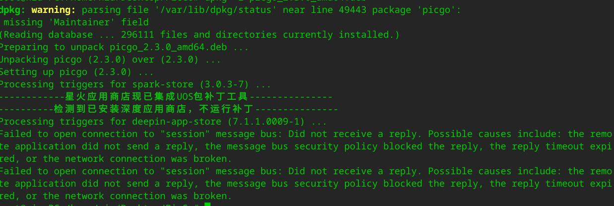话题回到PicGo,它的最新版本是2.3.0,然而下载地址github中只有appimage的包,没有deb包,这就让我有了学习如何打包的念头,然后我就根据上述的第一个博客地址操作了一下,打包过程比较顺利,然而,在安装的时候提示如下: