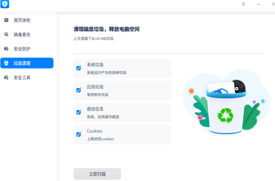 1、我今天打开系统自带的安全中心进行垃圾清理,点开垃圾清理