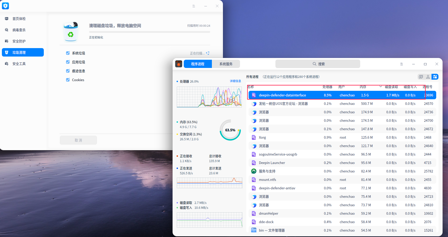 简单描述就是安全中心进行垃圾清理扫描时,进程deepin-defender-datainterface会无限吃内存,然后直到电脑死机